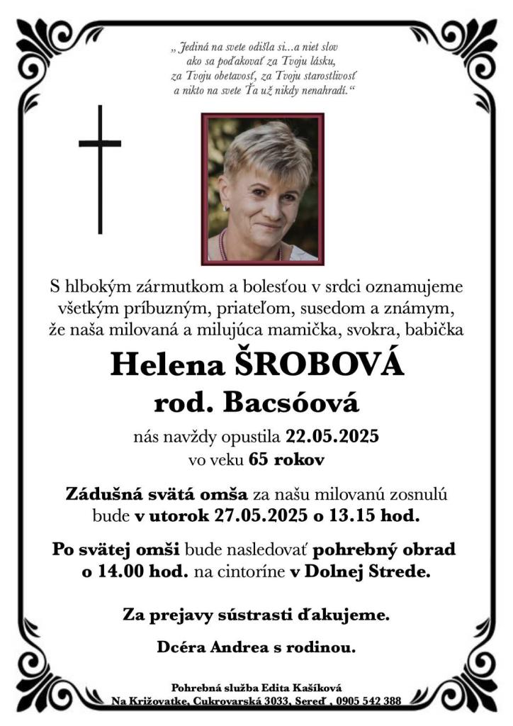 Smútočné oznámenie - Helena Šrobová, rod. Bacsóová 1