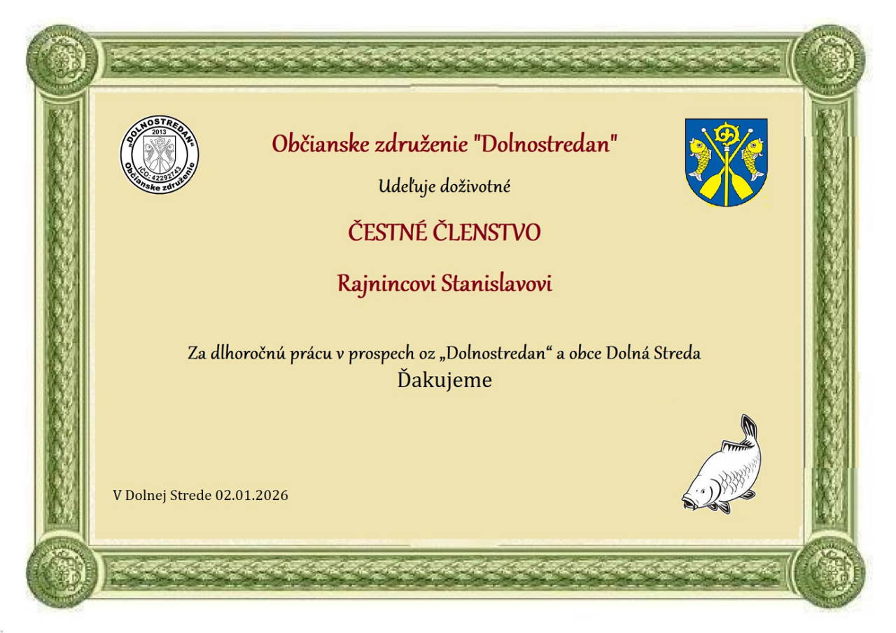 Členom občianskeho združenia „Dolnostredan“ pánom Stanislavovi Rajnincovi, Ivanovi Šípošovi, Hlaváčovi Jozefovi a Milošovi Oravcovi boli odovzdané pamätné diplomy z udelenia „Čestného členstva“ ako poďakovanie za ich dlhoročnú prácu v prospech oz „Dolnostredan“ a obce Dolná Streda.