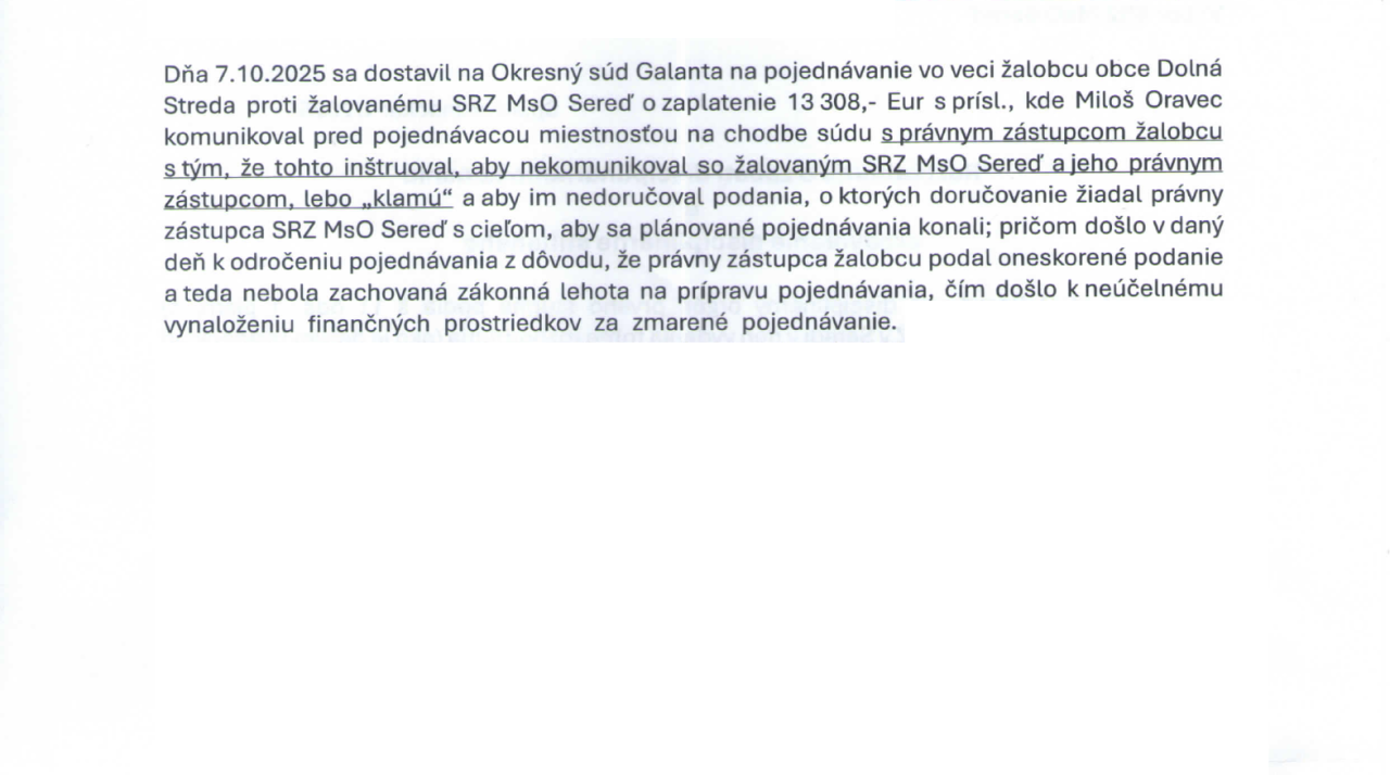 Dnes mi bolo zo strany výboru MsO SRZ Sereď doručené „Rozhodnutie o začatí disciplinárneho konania“ voči mojej osobe na základe toho, že zastupujem obec Dolná Streda a občianske združenie „Dolnostredan“ v konaní na Okresnom úrade v Galante v prípade žiadosti MsO SRZ Sereď o vydanie rozhodnutia že Rameno v Dolnej Strede je vodný tok, a že dňa 7.10.2025 som sa dostavil na Okresný súd v Galante na pojednávanie vo veci žalobcu obce Dolná Streda proti žalovanému SRZ MsO Sereď o zaplatenie 13308,- Eur s prísl., kde som údajne komunikoval pred pojednávacou miestnosťou na chodbe súdu s právnym zástupcom žalobcu s tým, že tohto som vraj inštruoval aby nekomunikoval so žalovaným SRZ MsO Sereď a jeho právnym zástupcom, lebo „klamú“ a aby im nedoručoval podania, čím presadzujem opačné záujmy ako sú záujmy MsO SRZ Sereď a v tejto veci som poslal podnet aj ministrovi vnútra Slovenskej republiky, a preto vraj SRZ ohováram na najvyšších inštanciách a krivo ho obviňujem z korupcie.