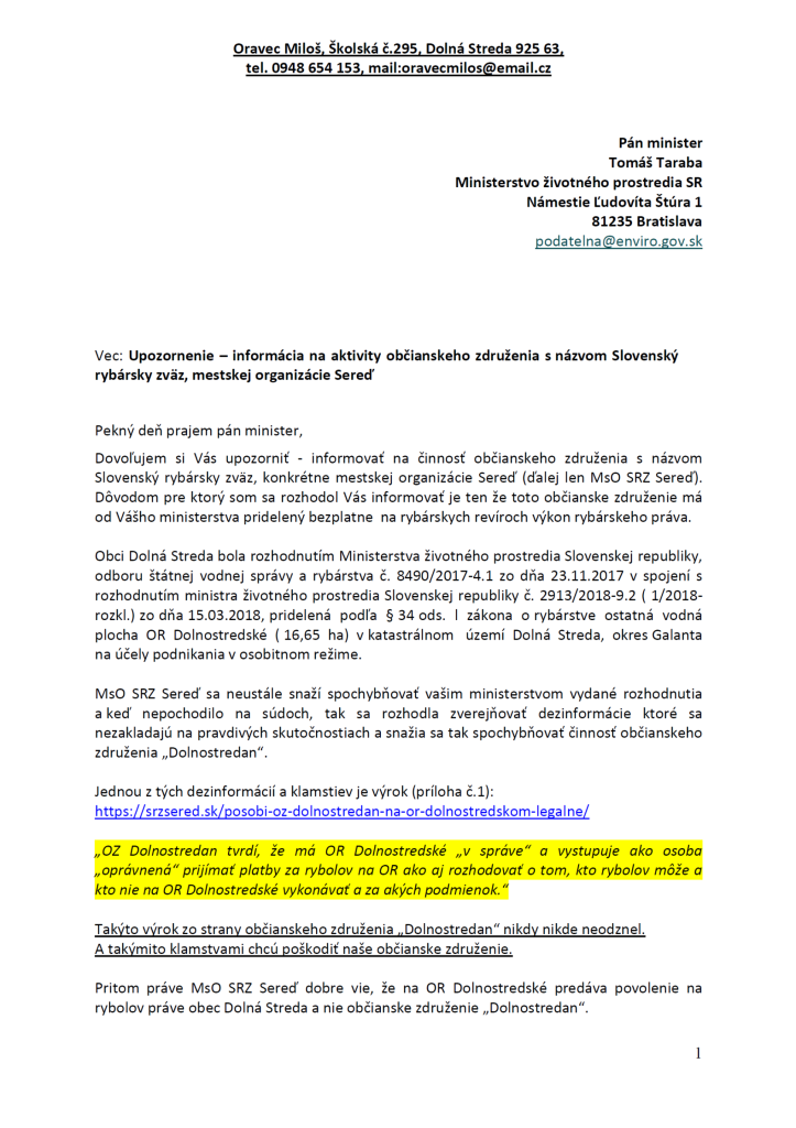 Na takéto konanie som samozrejme upozornil pána podpredsedu vlády a ministra životného prostredia Slovenskej republiky Tomáša Tarabu, nech pán Taraba vie ako koná podľa uverejneného oznamu „Výbor MsO SRZ Sereď“.
