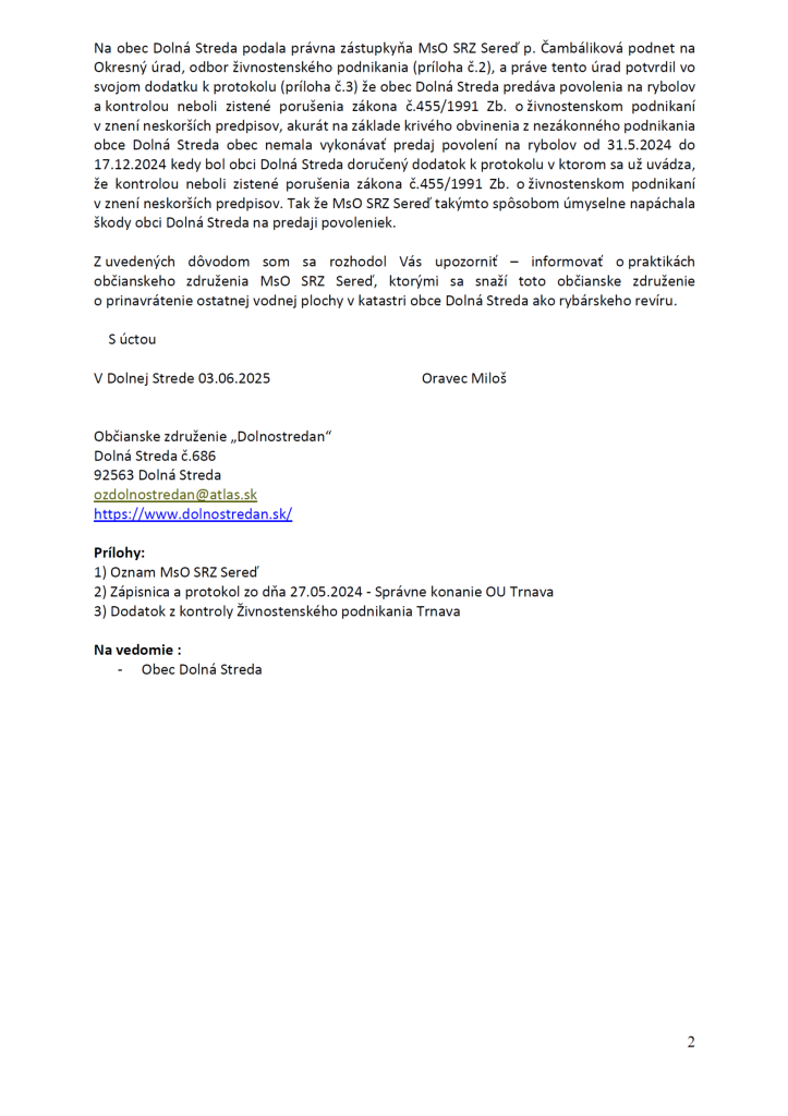 Výbor MsO SRZ Sereď alebo aspoň jeho predseda Dušan Alina vie že je to klamstvo, nakoľko on najal právnu zástupkyňu p.Čambálikovú, ktoré nelenila a poslala podnet na obec Dolná Streda na Okresný úrad, odbor živnostenského podnikania, kde však dobre nepochodila. Ale z podnetu ako aj Protokolu z kontroly vyplýva, že teda títo dvaja vedia že povolenky predáva obec a nie občianske združenie „Dolnostredan“, ako z toho vyplýva aj to že týmto bola poškodená obec ktorá nemohla predávať povolenie na rybolov od 31.5.2024 do 17.12.2024, kedy bol obci Dolná Streda doručený dodatok k protokolu v ktorom sa už uvádza, že kontrolou neboli zistené porušenia zákona č.455/1991 Zb. o živnostenskom podnikaní v znení neskorších predpisov. Tak že MsO SRZ Sereď takýmto spôsobom úmyselne napáchala škody obci Dolná Streda na predaji povoleniek.