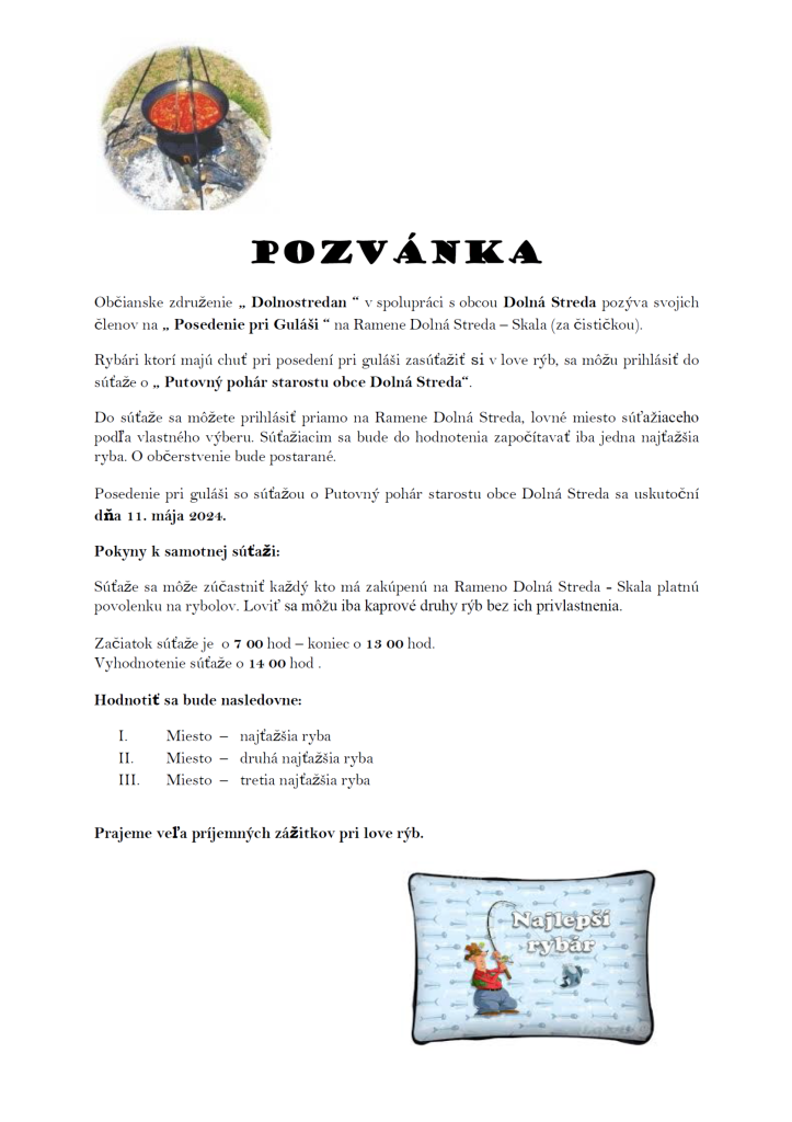 Občianske združenie „ Dolnostredan “ v spolupráci s obcou Dolná Streda pozýva svojich členov na „ Posedenie pri Guláši “ na Ramene Dolná Streda – Skala (za čističkou).